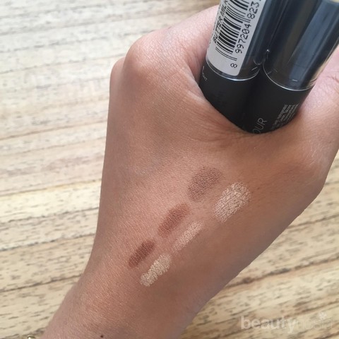 Untuk countour secara keseluruhan warna cokelatnya termasuk warm dan tidak kemerahan. Sedangkan warna highlight-nya berupa putih tulang dengan shimmer yang cantik. Untuk finishing-nya lebih ke creamy matte.