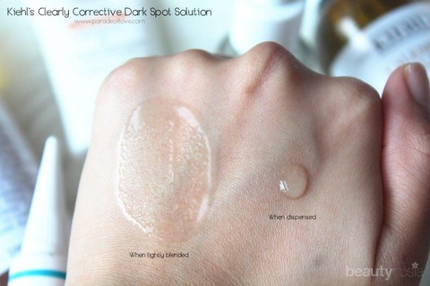 Kiehl's Clearly Corrective Dark Spot Solution memiliki formula tanpa paraben, tanpa silikon, tanpa pewangi, dan tanpa pewarna buatan lho, Beautynesian. Warnanya bening dan teksturnya cair sekali seperti air. Karena tekstur watery, sangat mudah diaplikasikan, diratakan dan tentunya cepat meresap di kulit. Ada efek sejuk juga waktu diaplikasikan di kulit wajah.