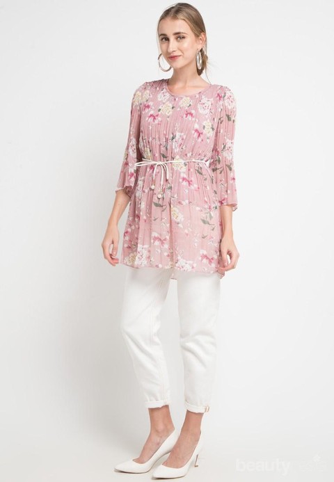 Aksen floral yang menghiasi blouse memberi kesan ceria dan penuh semangat. Model ini sangat sesuai bagi wanita dewasa usia 27 tahun ke atas. Tentu, sebagai seorang wanita dewasa tetap ingin tampil fresh, ceria dan awet muda. Kamu bisa menggunakannya untuk pergi ke kantor atau kuliah. Mix and match dengan bawahan celana kain yang sedikit ketat atau cukup dengan celana jeans. Sempurnakan keanggunanmu dengan memakai high heels warna pastel ya. Bisa pilih warna cream, putih atau warna peach yang senada.
