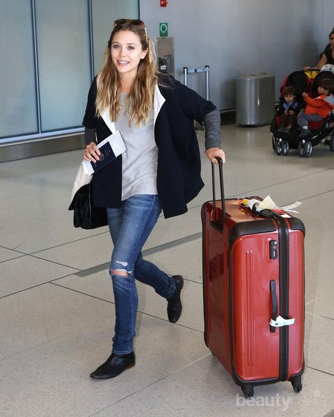Elizabeth Olsen tampil cantik dan kasual dengan ripped jeans dan jaket oversizenya. Cool!