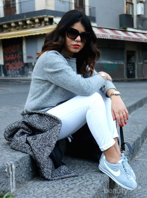 long sleeves abu-abu, kemudian kamu padukan dengan celana berwarna putih. Jangan lupa untuk memilih sepatu dengan warna pastel untuk menyempurnakan penampilanmu.