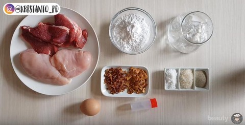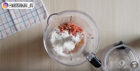 Kemudian haluskan daging ayam, daging sapi, serta es batu menggunakan