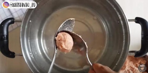 11. Cetak bakso dengan menggunakan bantuan sendok. Cetak ukuran bakso sesuai selera ya, bisa ukuran kecil ataupun besar.