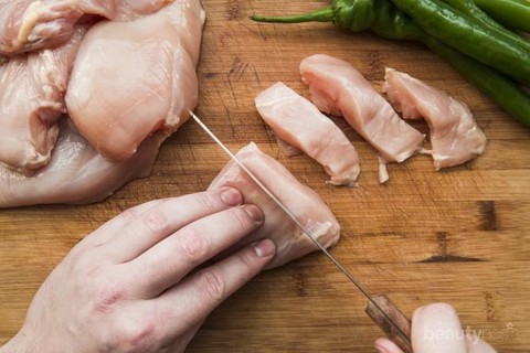 - Cuci daging ayam kemudian potong menjadi bagian kecil-kecil dan pisahkan dari tulangnya. Kamu bisa merendam daging ayam dalam air jeruk nipis selama 15 menit untuk membantu menghilangkan bau amisnya.