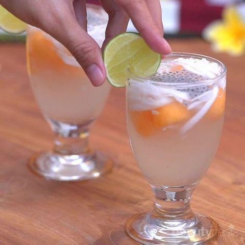- Tambahkan biji selasih. Tuang air putih dan bisa ditambah es jika suka dingin. Beri daun mint sebelum disajikan.