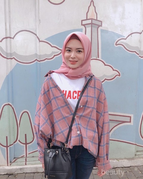 casual. Seperti penampilannya dengan kaus ini yang dia padukan bersama kemeja kotak-kotak kekinian. Wanita kelahiran 28 Desember 1995 ini menambah kesan manis dipenampilannya dengan mengenakan hijab segiempat berwarna