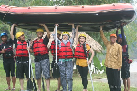 Sebagai olahraga air dengan menggunakan perahu, para peserta rafting memang kelihatan hanya duduk tanpa banyak melakukan aktifitas. Tapi, Minasan tentu tahu dong. Untuk membuat perahu berjalan seimbang dan tidak membuat kita jatuh dari perahu, Minasan perlu menjaga keseimbangan dengan mengikuti ritme dari pergerakan perahu. Selain itu, saat perahu Minasan berjalan di atas air yang tidak banyak menggerakkan perahu, Minasan dan tim harus berusaha keras untuk mendayung dengan sekuat tenaga. Aktifitas seperti ini berfungsi untuk membuat otot tubuh semakin kuat, lho.