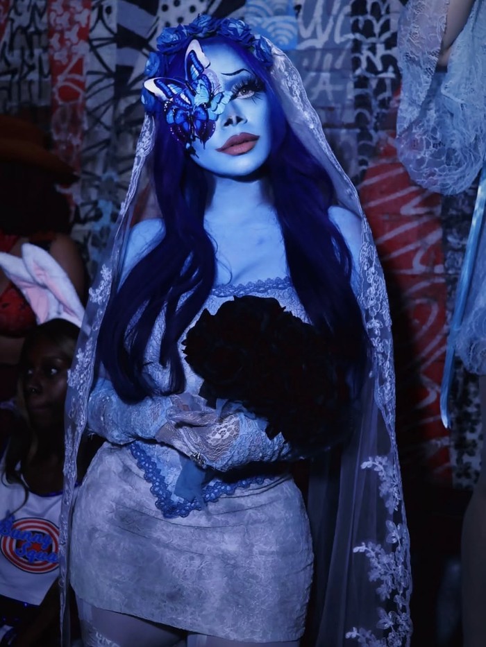 Lala Anthony menghadirkan karakter Corpse Bride karya Tim Burton dalam versi couture. Ia mengenakan gaun biru pucat dengan potongan korset dan kerudung renda panjang. Riasan mata besar, bibir pucat, dan efek body paint biru muda menambah kesan menyeramkan namun tetap memesona.