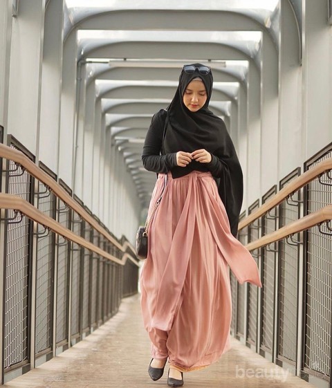 Selanjutnya ada potret candid menunduk ke bawah yang ditampilkan Wirda ketika berjalan. Terlihat ia berjalan dengan anggun dalam balutan outfit yang begitu match. Rok warna pastel dipadukan dengan baju dan pashmina hitam, tampakya memang menjadi fashion item yang klop.