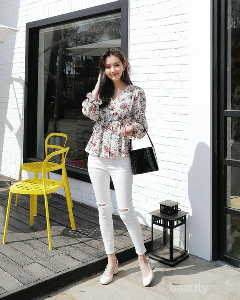 Foto: IstimewaKamu juga bisa memadukan white jeans dengan floral blouse saat berlibur. Untuk kesan lebih casual, kamu bisa memilih ripped white jeans, Ladies.