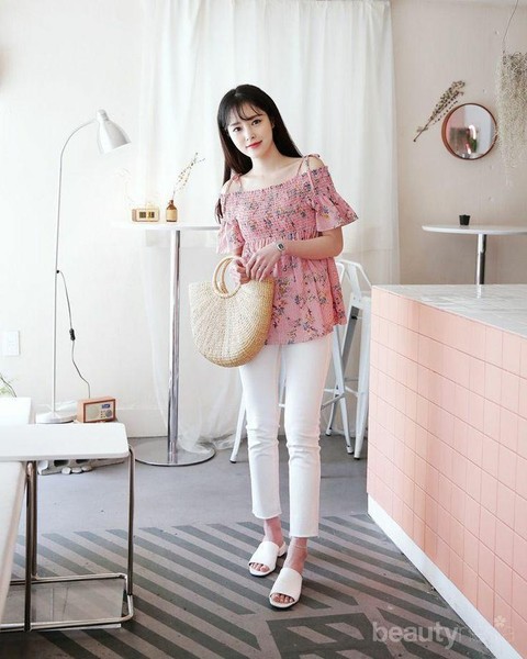Foto: IstimewaSaat liburan ke pantai, gaya yang satu ini juga bisa jadi andalan. White jeans, off shoulder blouse dan tas jerami membuat gaya kamu makin chic. Jangan lupa sandal flatnya, ya.