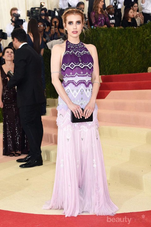 Wanita cantik pertama yang memilih gaun red carpet warna ungu adalah Emma Roberts. Ia memilih dress kombinasi warna ungu, ungu muda, dan putih. Sleeves dress bermodel halter neck ini bersiluet straight dan flowy di bagian bawah. Dress ini semakin manis dengan aplikasi geometris detail pada bagian atas.