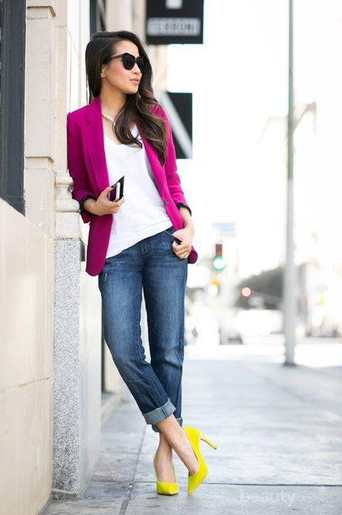 Ingin tampil modis ke kantor dengan celana jeans? Nah gaya satu ini bisa jadi inspirasi kamu, Ladies! Yakni, dengan memadu padankan celana jeans dan kaos dengan blazer supaya penampilan kamu sedikit formal. Penampilan seperti ini bisa bikin kamu tampil fashionable, apalagi jika kamu memakai penambahan aksesoris seperti kalung. Supaya penampilan makin maksimal, jangan lupa pakai high heels, ya!