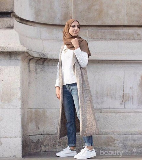 Ladies, buat kamu yang berhijab dan suka bingung cari padu padan celana jeans, gaya satu ini bisa jadi inspirasi kamu, lho! Ya, dengan memadu padankan celana jeans dan kaos yang kamu timpa dengan long outer, penampilan ini akan sangat cocok untuk ke kampus atau hang out ke mal. Nah, supaya penampilan kamu makin maksimal kerennya, jangan lupa pakai sneaker andalan kamu, ya!