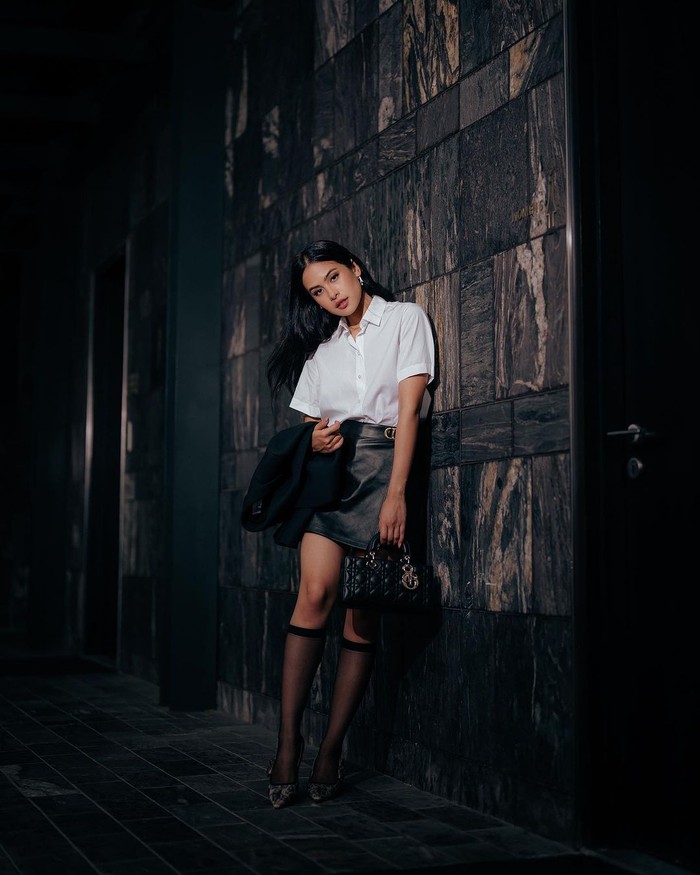 Contek gaya Maudy Ayunda saat mengenakan rok mini berwarna hitam, dipadukan dengan kemeja berlengan pendek warna putih. Ia juga menambahkan stoking hitam transparan dan high heels. Penampilan yang simple namun terkesan classy ya, Beauties!