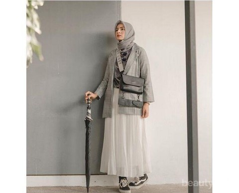 Foto: https://Instagram.com/bellattamimi/Blazer plaid abu-abu juga bisa kita padukan dengan dalaman dan hijab berwarna serupa, serta pleated skirt berwarna putih. Ataupun kalian bisa mix and match dengan warna monochrome lain termasuk hitam, dan juga family dari putih dan abu-abu itu sendiri. Atau kalau kalian mau sedikit menabrak warna, kalian bisa menambahkan aksen warna emas dalam tampilan kalian.