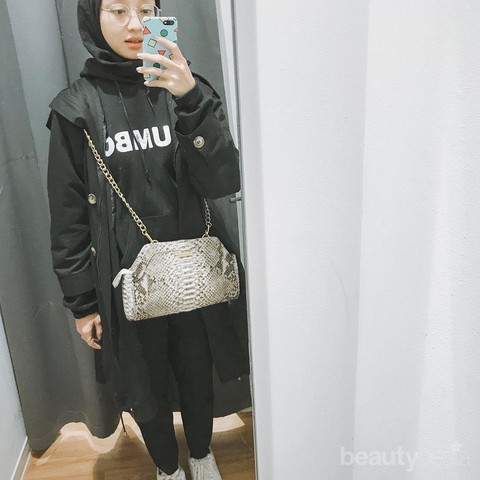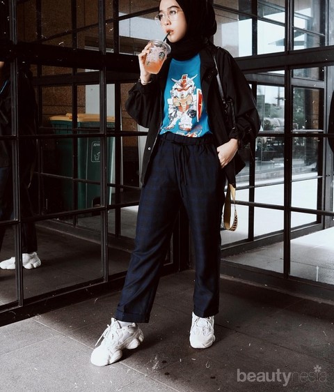 Cara paling mudah untuk berpenampilan ala streetswear adalah dengan menggunakan hoodie. Style ini terinspirasi dari para skateboarder yang sering mengenakan hoodie ketika melakukan aksinya. Agar lebih aman, kamu bisa memilih hoodie dengan warna-warna basic misalnya saja hoodie berwarna hitam seperti yang dipakai oleh Gita Savitri Devi ini. Untuk menampilkan gaya streetswear yang lebih kuat, kamu bisa memadukannya dengan bomber jacket dan sneakers. Hijabers style sangat bisa kamu tiru lho!
