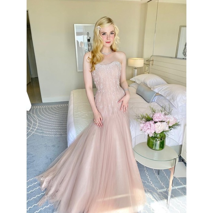 Elle Fanning tampil seperti putri dongeng dalam gaun Armani Privé warna pink yang penuh sulaman kristal/Foto: instagram.com/ellefanning