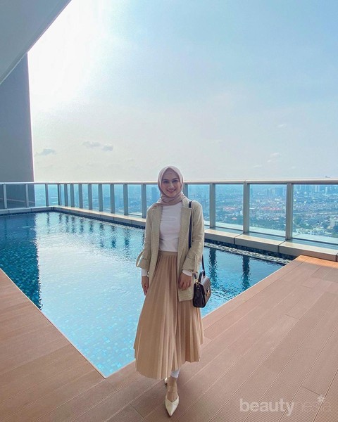 Foto: https://www.instagram.com/melodylaksani92/Blazer merupakan salah satu fashion item yang dapat membuat penampilan terkesan lebih dewasa. Dalam penampilan ini, Melody Laksani tampil elegan dengan padu padan kaos putih yang berbalut tartan blazer dan pleated skirt berwarna latte. Gayanya semakin tampak anggun dengan gaya hijab segi empat yang diikat simpel ke belakang dan padanan pointed heels yang memberi kesan formal.