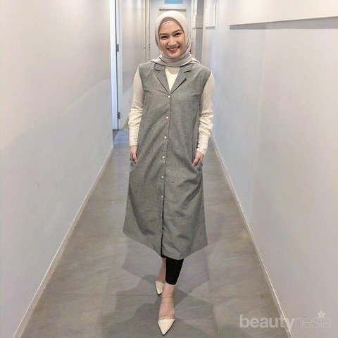 Foto: https://www.instagram.com/melodylaksani92/Masih bergaya elegan dengan kesan formal, penampilan wanita kelahiran Bandung ini juga membuatnya terkesan lebih dewasa. Ia mengenakan atasan putih yang dipadukan dengan long vest bernuansa earthy dan legging hitam, kemudian memadankannya dengan hijab segi empat berwarna netral yang ditata simpel untuk sempurnakan penampilan.