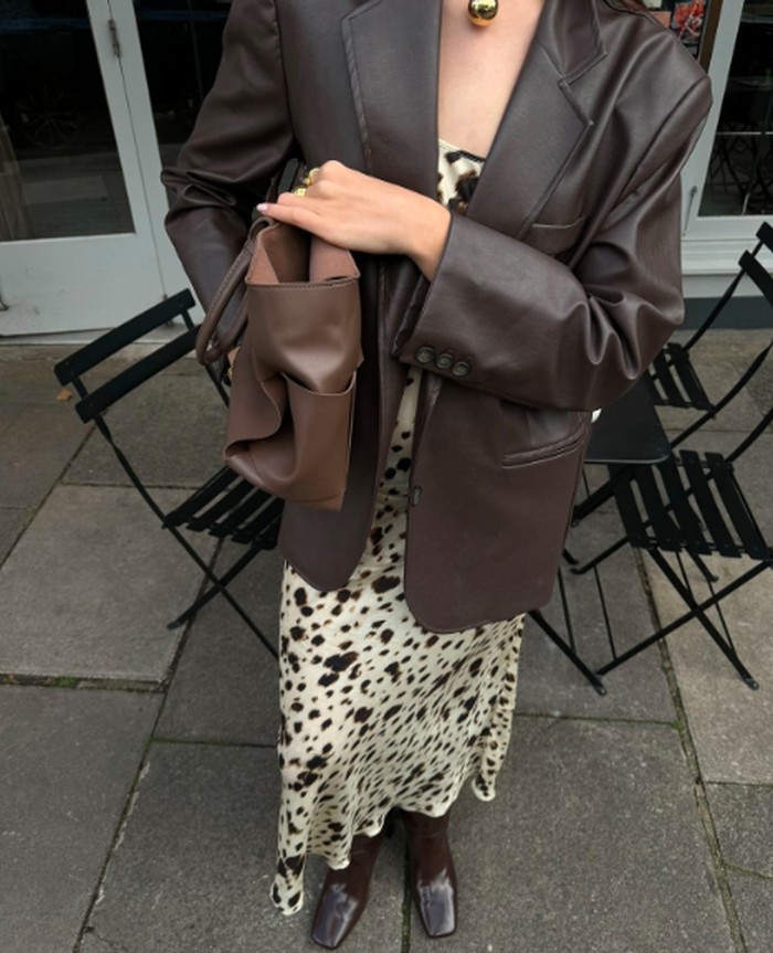 Padu padan animal print bisa terlihat classy jika dipasangkan dengan item yang tepat, seperti tampilan satu ini yang memadukan satin leopard slip dress dengan oversized leather blazer bernuansa coklat gelap. Gaya ini menunjukkan bagaimana animal print bisa tampil elegan tanpa terlihat berlebihan. Ditambah dengan sepatu boots dan tas kulit bernuansa senada, look ini sangat cocok untuk coffee date atau hangout santai di kota.
