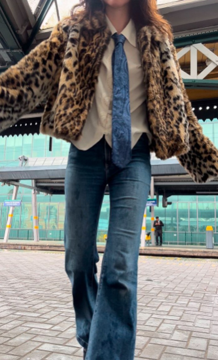 Untuk kamu yang suka statement look, paduan leopard fur jacket dengan kemeja putih dan dasi lebar adalah pilihan berani namun stylish. Celana denim model bootcut memberikan keseimbangan pada look yang cukup nyentrik ini. Gaya ini pas untuk kamu yang ingin tampil beda saat hangout sore atau saat traveling ke sudut-sudut kota yang estetik.