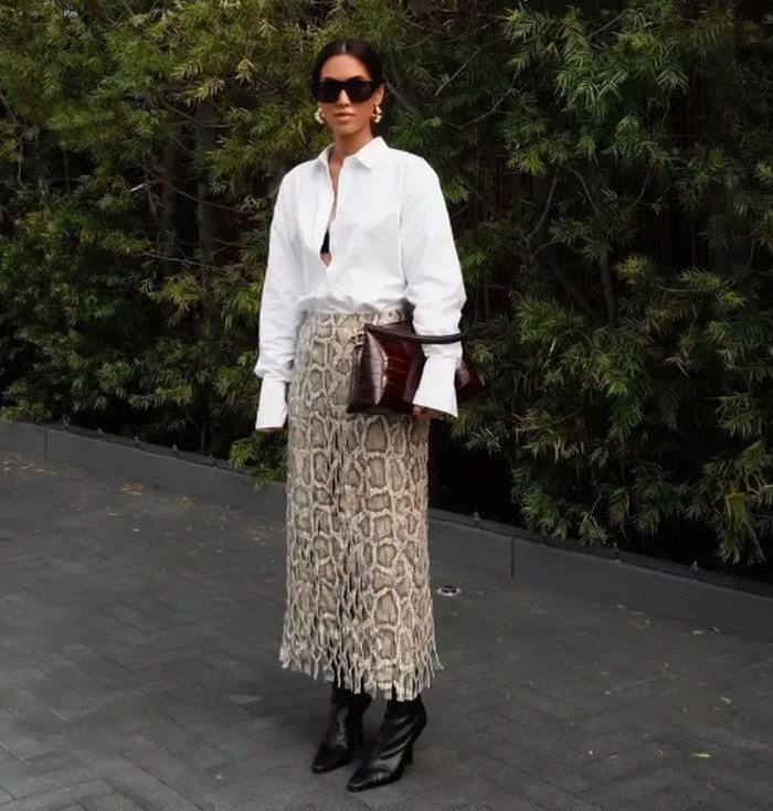 Jika kamu ingin animal print yang lebih subtle tapi tetap standout, pilih rok midi snakeskin print dan padukan dengan oversized white shirt yang klasik. Tampilan ini memberi kesan mewah sekaligus effortlessly chic. Dengan sentuhan aksesori seperti anting besar, tas clutch bertekstur, dan boots hitam, look ini sangat cocok untuk event semi-formal hingga dinner stylish.