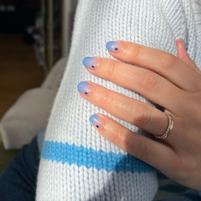 Nail art ombre dengan tren warna Lebaran 2024 yaitu biru muda atau pink muda adalah pilihan yang sangat cantik dan feminin untuk menambahkan sentuhan yang soft pada kuku. Untuk warna base, kamu bisa menggunakan warna yang mirip dengan warna kuku asli dan memberi warna biru atau pink pada bagian ujung kuku.