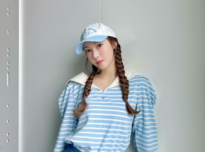 Paduan long sleeve tee motif striped dengan celana pendek jeans berwarna biru cocok untuk berbagai aktivitas. Kamu bisa meniru gaya rambut Jessica yang dikepang dua, tambahkan topi baseball untuk tampilan yang lebih sporty. Gunakan sneaker agar lebih nyaman saat jalan-jalan.