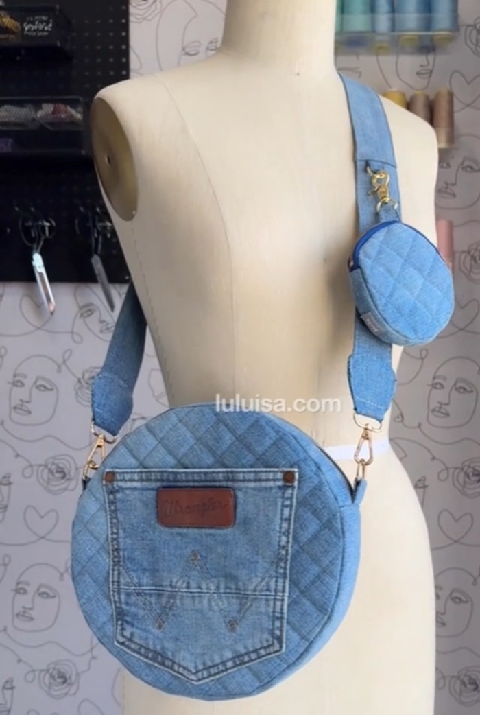Ia juga membuat tas kecil seperti dompet koin yang menggunakan jeans yang sama, rivet dan ritsleting asli dari jeans tersebut. Jadilah sling bag yang cantik dan terlihat kokoh dari upcycling jeans, Beauties!