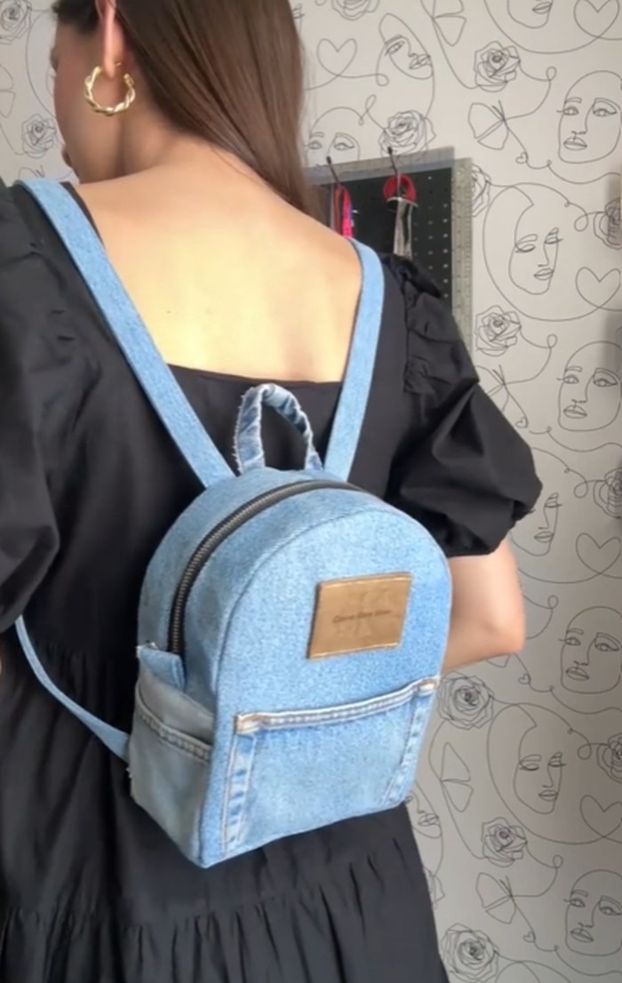 Designer Luisa menyulap jeans pendek merk Calvin Klein menjadi mini backpack denim yang chic. Ia memotong bagian-bagian dari celana, termasuk dengan saku belakang yang akan digunakan kembali sebagai bagian dari kantong tas depan. Ia membuat pola, menambahkan ritsleting di bagian atas, dan juga diberi aksen label kulit “Calvin Klein Jeans”. Mini backpack yang keren, stylish, dan sustainable!