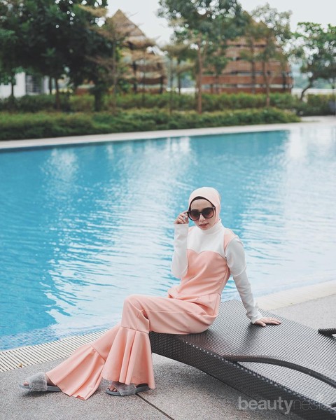 Baju renang muslimah selanjutnya yang dapat kamu jadikan inspirasi adalah dari Hijabers cantik Hamidah Rachmayanti. Untuk baju renangnya Hamidah memadukan warna abu dan warna khaki.