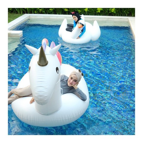 Hijabers Indonesia cantik ini juga tidak ketinggalan mengabadikan foto saat berenang Ladies. Joyagh tampil hits dengan baju renang berwarna peach dan putih. Menariknya, baju renang muslimah Joyagh ini memiliki cutting yang lucu Ladies.