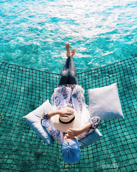 Sama halnya dengan Dian Pelangi, Hamidah juga memiliki baju renang dengan perbaduan atasan, celana panjang dan turban. Tetapi Hamidah menggunakan warna polos abu untuk atasan dan warna khaki sebagai celana serta turban. Cocok banget nih untuk dijadikan inspirasi baju renang weekend ini.