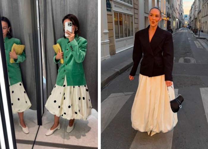 Inspirasi pertama datang dari paduan blazer polos dengan dress flowy yang langsung menciptakan kesan elegan dan feminin. Kamu bisa meniru gaya ini dengan plain blazer warna statement seperti hijau emerald atau hitam klasik, lalu dipadukan dengan dress bermotif kekinian seperti polkadot atau dress bertekstur ringan.