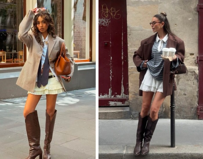 Inspirasi ketiga ini cocok buat kamu yang suka tampil playful tapi tetap fashion-forward. Blazer dipadukan dengan mini skirt menciptakan kesan preppy, youthful, dan trendi, apalagi kalau ditambah kemeja, dasi, atau knee-high boots.