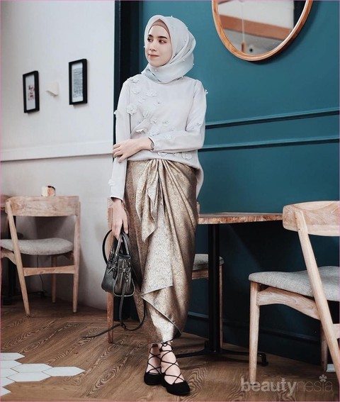 Amel menetralisir warna emas yang mencolok dengan atasan kebaya dan hijab berwarna dust blue. Disandingkan dengan sepatu dan tas berwarna hitam memberikan efek netral sehingga tidak ada warna lain yang menabrak warna rok yang sudah mencolok. Inspirasi kebaya ini cocok kamu gunakan untuk menghadiri acara-acara keluarga atau reuni resmi. Menarik perhatian tapi tidak berlebihan.