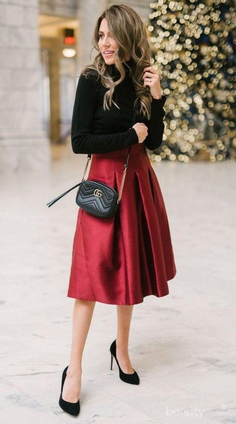 Nah, jika kamu ingin menggunakan nuansa merah pada baju natal, kamu bisa mencoba menggunakan rok merah dan atasan hitam seperti pada gambar ini. Jangan lupa tambahkan tas mungil berwarna senada dan gunakan highheels hitam.