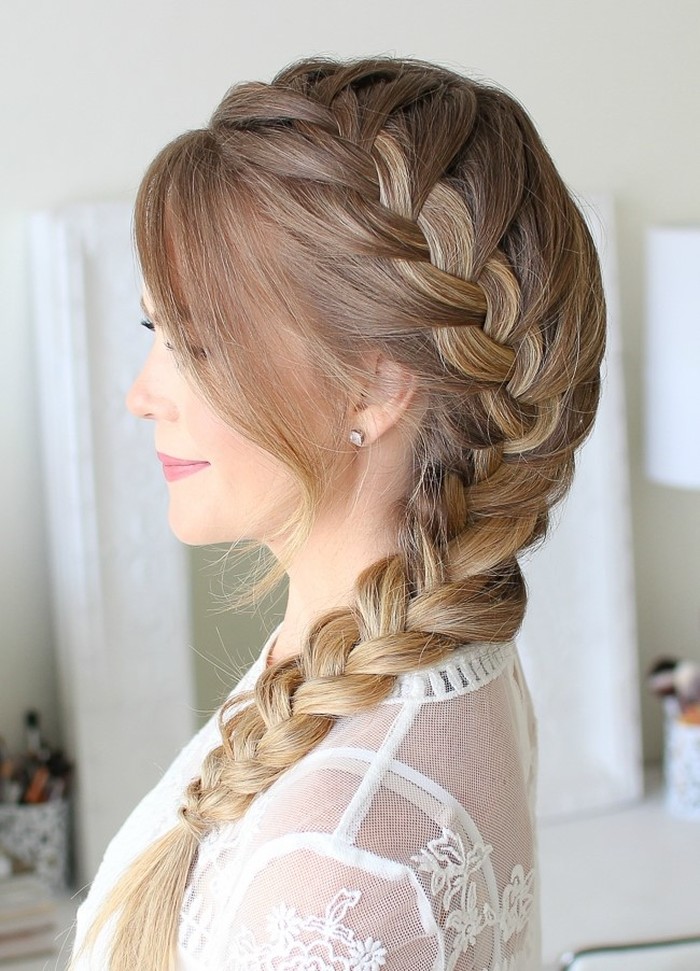 Model rambut ini cocok untuk rambut panjang maupun pendek. Caranya adalah dengan membuat belahan rambut samping. Kemudian, kepang rambut dengan mengambil sedikit demi sedikit rambut saat mengepang di mulai dari bagian kanan atas sampai ke bagian bawah.Â