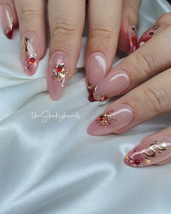 Desain ini adalah kombinasi yang sangat cocok untuk merayakan Tahun Baru Imlek. Dengan dasar kuku berwarna nude yang hampir seperti warna kulit kemudian pada bagian ujung kuku diberi lekukan dan gradasi halus berwarna merah. Flakes berwarna emas memberikan sentuhan kemewahan.
