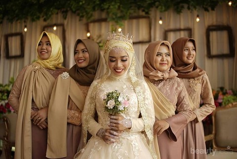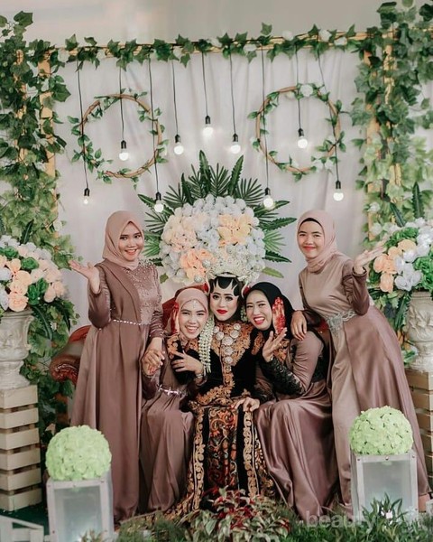 braidesmaid dengan gaya muslimah. Dengan bahan ini, kamu dan sahabat lainnya akan tampak elegan dan juga kompak. Agar tidak terlihat beda, kamu bisa membuat janji dengan temanmu mengenai desain yang akan kamu gunakan. Misalnya saja, kamu menggunakan desain