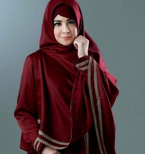 Artis ini memutuskan mengenakan hijab sejak 2013 hingga sekarang. Risty Tagor tampil cantik dengan balutan gamis dan kerudung berwarna merah marun dengan aksen silver di pergelangan tagan dan pinggir kerudungnya. Model kerudung ini sangat cocok buat kamu yang suka warna gelap tapi ingin terlihat anggun. Pad hitam juga bisa menambah cantik penampilan kamu.