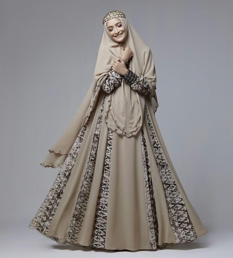 Buat kamu yang suka warna agak soft, kamu bisa mencoba model kerudung instan ala Ineke Koesherawati. Perpaduan warna coklat susu dengan border emas di bagian ujung kerudung membuat Ineke terlihat elegan. Dress yang berbentuk payung dengan beberapa kain batik di beberapa sisi membuat wanita terlihat lebih stylish. Model ruffle di bagian bawah membuat semakin anggun dan enggak terlihat gemuk. Fashion hijab ini cocok buat kamu yang sedikit berisi.
