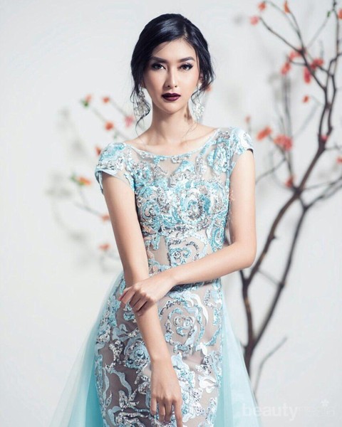 Selanjutnya ialah kebaya modern dari Kevin Liliana. Kebaya ini memiliki nuansa biru yang soft. Detail motif mawar yang timbul menghiasi seluruh permukaan kebaya. Potongan lengan pendek dari kebaya memperlihatkan sisi modern. Aksen kain tulle yang menjuntai di bagian belakang menambah kesan anggun dan elegan. Nuansa biru juga semakin menambah aura cantik seorang Kevin Liliana.