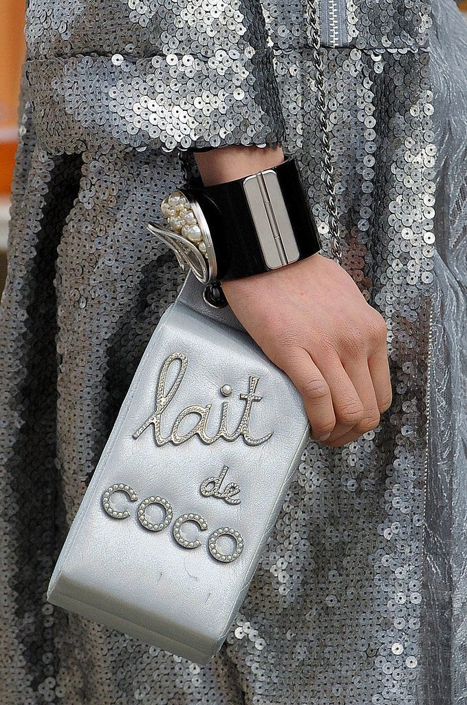 Masih dari koleksi yang sama, kali ini desain yang lebih playful berupa susu kemasan. Dilansir dari Bag Hunter, tas ini dibuat menggunakan material lambskin dan berhiaskan kristal dan mutiara. Situs 1stDibs, menjual preloved tas ini seharga 7900 USD sekitar Rp112,5 juta.