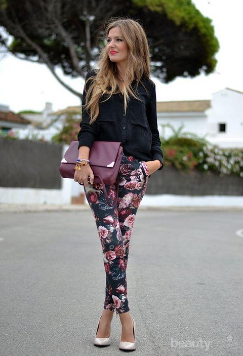 Ingin gaya yang lebih feminine? Cobalah untuk memadukan atasan hitam dengan bawahan bermotif bunga-bunga. Style ini pas banget untuk digunakan saat kamu sedang berlibur. Kamu bisa mengenakan kaos hitam polos dan rok bunga-bunga untuk dipakai saat berjalan-jalan.