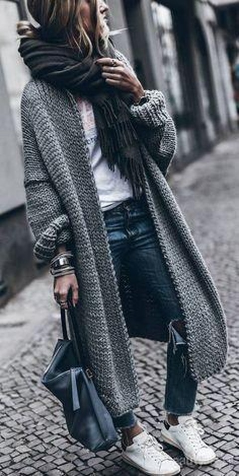 Kamu punya long wool cardigan yang panjangnya menyentuh kaki? Biar terlihat stylish namun tetap kasual, kamu bisa memadukannya dengan kaus putih simpel yang dimasukkan ke dalam jeans favoritmu. Nggak lupa pasang sneaker favoritmu biar makin kece!
