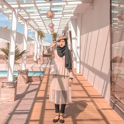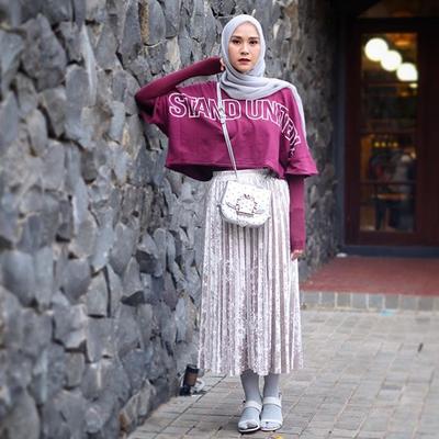 Meskipun berhijab, crop top ungu tua lengan pendek tetap bisa dipakai, kok, asalkan diberi dalaman manset, yang warna senada akan membuatnya tampak lebih matching. Kemudian beri unsur pastel dengan memakai outift serba abu-abu muda mulai dari kerudung, rok, kaus kaki panjang, sampai alas kaki baik sandal maupun sepatu. Pemilihan pleated skirt sebatas betis dengan aksen glittery atau bling-bling membuatnya jadi tampak lebih manis. Kawaii!