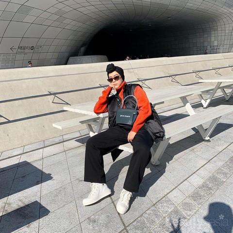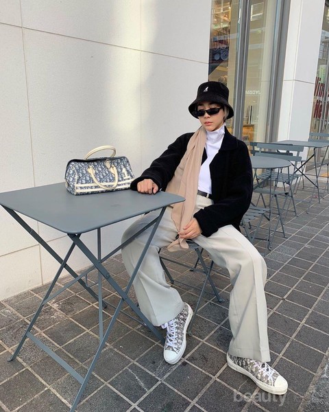 Selain beret hat, influencer cantik ini juga kerap bergaya hypebeast dengan aksesoris bucket hat. Topi ini membuat penampilannya tampak semakin terlihat boyish dan stylish. Dalam look ini, ia tampil dengan kaos turtleneck putih dan jaket hitam, kemudian memadukannya dengan kulot abu-abu. Ia lalu menambahkan turban simpel dan bucket hat hitam untuk melengkapi penampilannya.