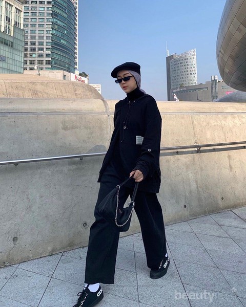 Tampil stylish dengan outfit monokrom, Intan Khasanah memadukan kaos turtleneck, jaket dan celana berwarna hitam dalam gayanya ini. Ia kemudian melengkapi penampilan dengan turban kasual yang diikatkan di bagian belakang, lalu menambahkan beret hat yang membuatnya semakin trendy.